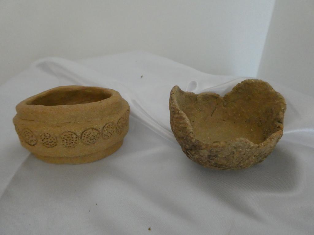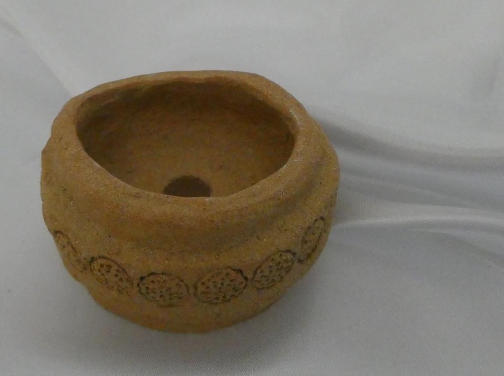Ces petits contenants en grès beige captivent par leur simplicité rustique et leur charme naturel. Adoptant une esthétique organique, chaque pièce est façonnée pour accueillir des kusamono, ces compositions végétales délicates qui apportent une touche de nature intérieure. Le premier contenant, d’une hauteur de 5 cm et d’un diamètre de 7 cm, arbore une belle frise décorative qui évoque les motifs millénaires des civilisations anciennes. Cette frise, avec ses reliefs subtils, capte la lumière de manière envoûtante, soulignant ainsi la texture granuleuse du grès.