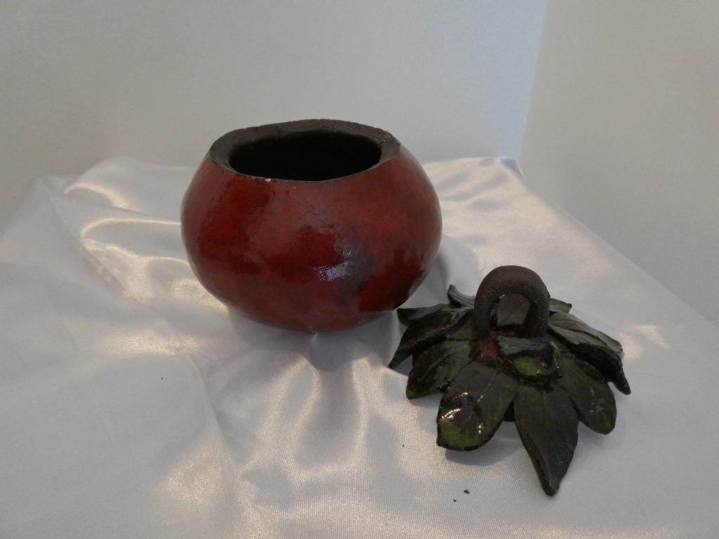 Découvrez cette boîte en grès noir chamotté, émaillée rouge avec des feuilles vertes, incarnant la beauté d’une pomme. Parfait pour la décoration ou la collection, elle allie tradition et modernité.
