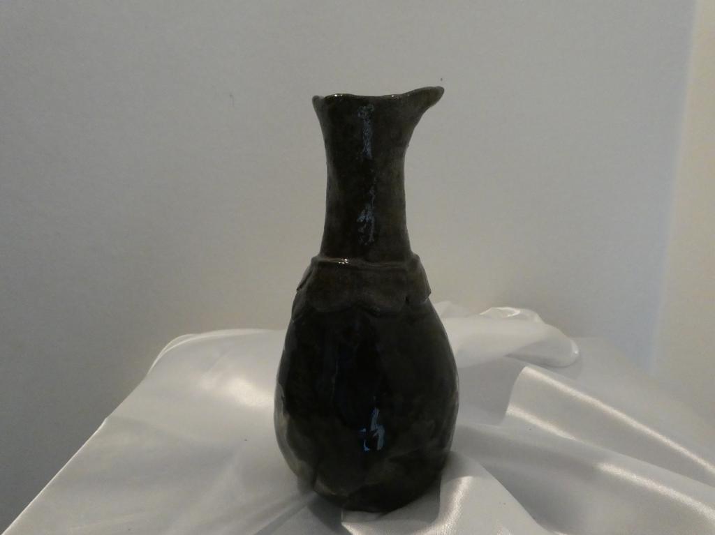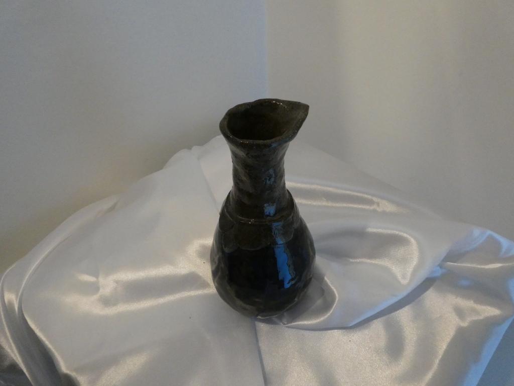 Ce vase à bec est une œuvre remarquable, alliant la puissance du grès noir chamotté à la délicatesse des émaux transparents et bleus de Sèvres. Avec ses dimensions équilibrées de 18 cm de hauteur et 8 cm de diamètre, il s’inscrit parfaitement dans un espace contemporain ou traditionnel, ajoutant une touche de mystère et d’élégance. La texture granuleuse du grès contraste magnifiquement avec la surface lisse et brillante de l’émail, créant un dialogue visuel captivant.