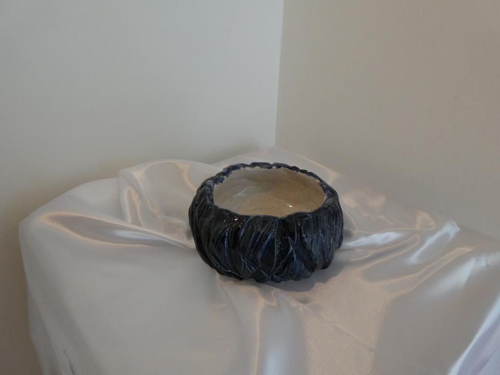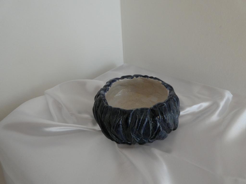 Le choix de l’émaillage bleu de Sèvres ajoute une dimension supplémentaire à cette pièce, mariant tradition et modernité. Ce bleu profond, presque velouté, attire l’œil et contraste superbement avec la texture audacieuse de la surface, créant un jeu subtil de lumière et d’ombre. Le grès chamotté, par sa robustesse apporte une assise rassurante et un poids chaleureux à l’œuvre, garantissant sa durabilité au fil du temps.